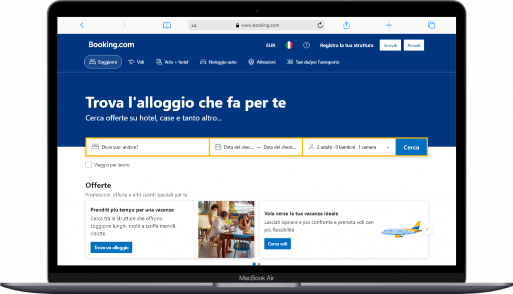 🥇 Tra le migliori aziende del settore Booking.com, primo sito nella classifica del Turismo nell’Ecommerce italiano, offre una vasta gamma di servizi che la rendono la scelta preferita da milioni di viaggiatori in tutto il mondo. La sua versatilità è uno dei suoi punti di forza, poiché permette di prenotare non solo soggiorni in hotel, ma anche voli, pacchetti volo+hotel e noleggio auto, garantendo un’esperienza di viaggio completa e senza complicazioni. Inoltre, Booking.com va oltre le prenotazioni convenzionali, consentendo di prenotare anche attrazioni e taxi da/per l’aeroporto, fornendo tutto ciò che serve per rendere il viaggio più agevole.