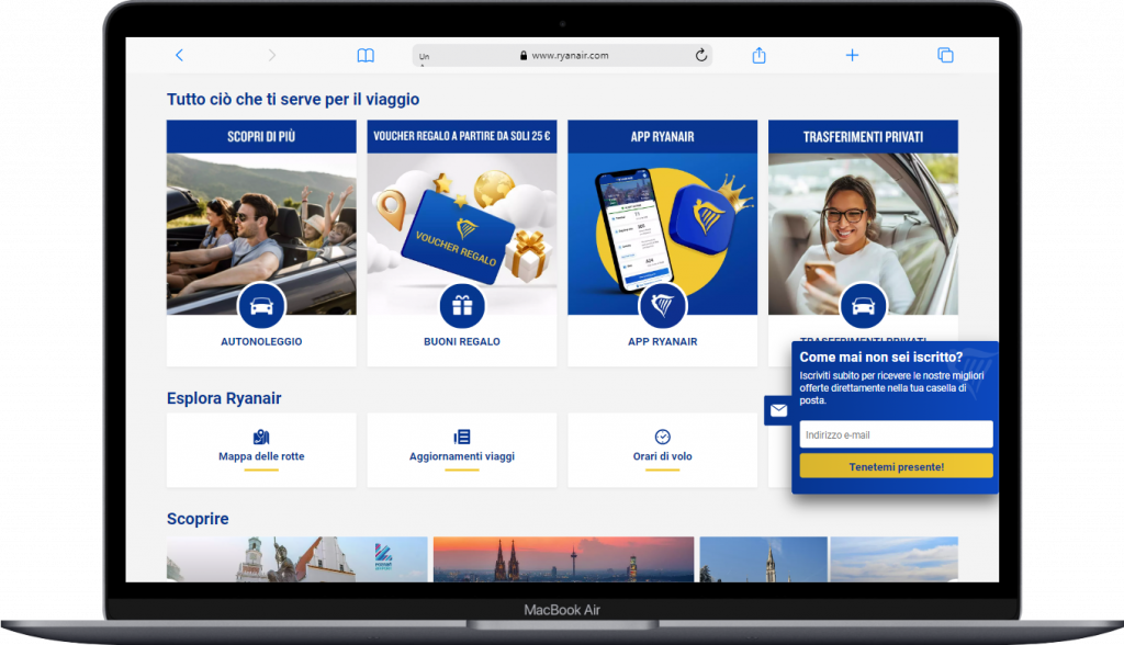 Tra i servizi offerti da Ryanair, sono presenti voli, autonoleggio, hotel, eventi e attività, per coprire le diverse esigenze di viaggio in un’unica piattaforma. I viaggiatori possono prenotare voli per numerose destinazioni a tariffe competitive. Inoltre, Ryanair offre la possibilità di acquistare voucher regalo, a partire da 25 euro, rendendo i suoi servizi un’ottima idea per regali speciali e sorprese per i propri cari.