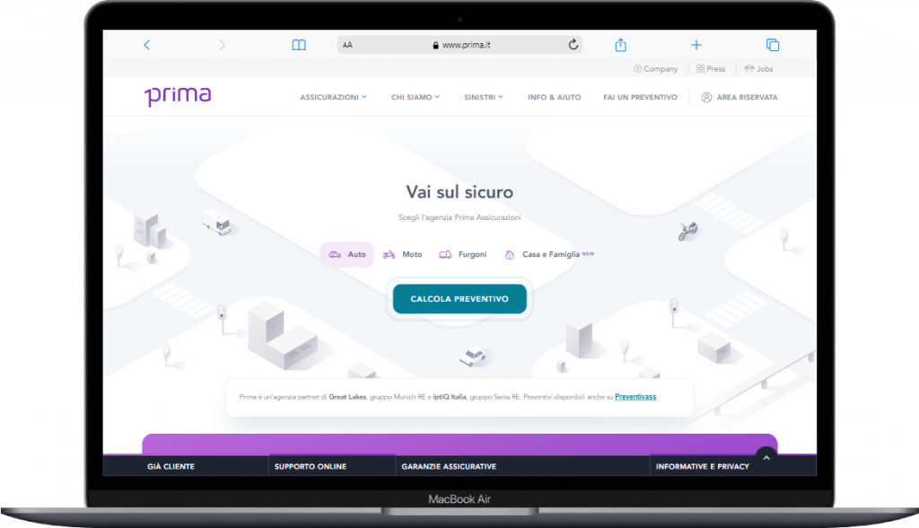 Prima è una tech company che opera come agenzia assicurativa specializzata nella vendita di polizze auto, moto, furgoni, casa, famiglia e infortuni, emersa da qualche anno come una forza nel settore assicurativo italiano.